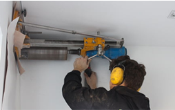 Bij betonwanden zullen we moeten boren met een watergekoelde boor. We zullen dit koelwater met een afzuigring afzuigen. Er is een kans dat er een klein beetje water langs de wand loopt en op de grond terecht komt. Ook betonboren geschiedt op eigen risico, incl. dit koelwater-risico.